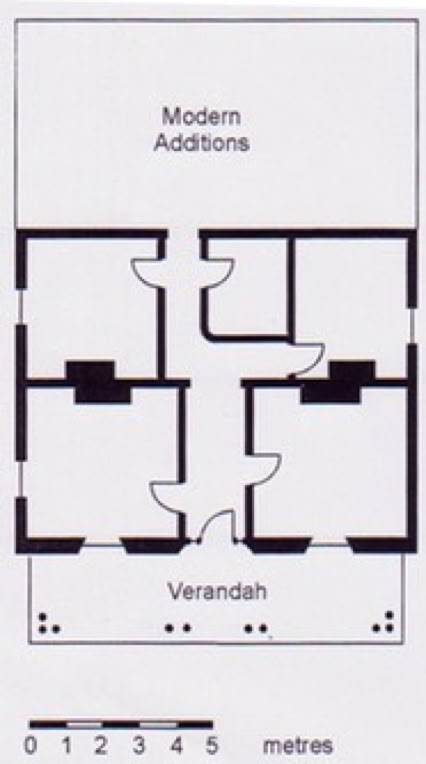 Note the positions of the chimneys and the curved wall in the corridor. The shared fire-place cavities were in the form where the wrought iron covers and fire grills on each side of the wall shared the chimney. The fireplace was very effective at heating the room. The author can remember staying occasionally in the front room snug and secure in Winter time.