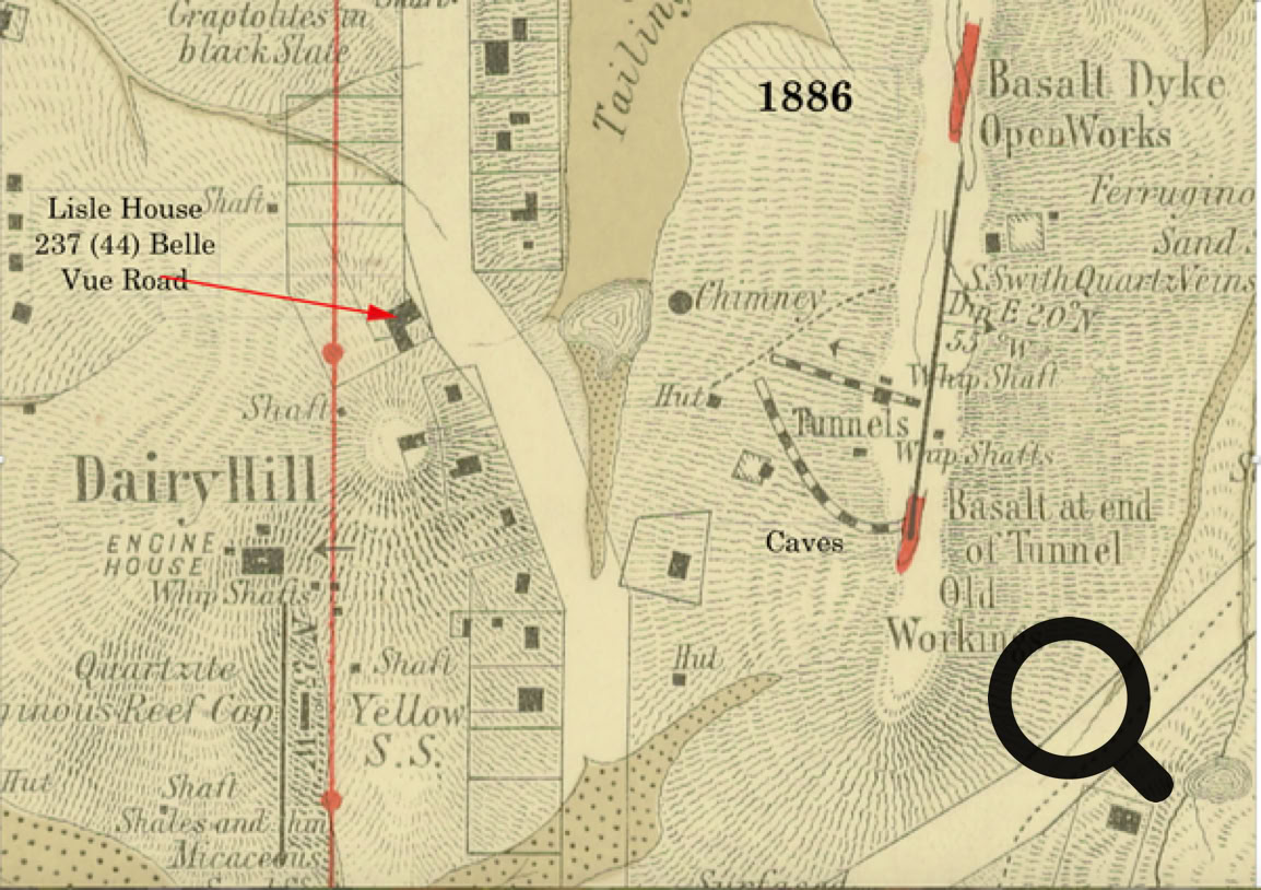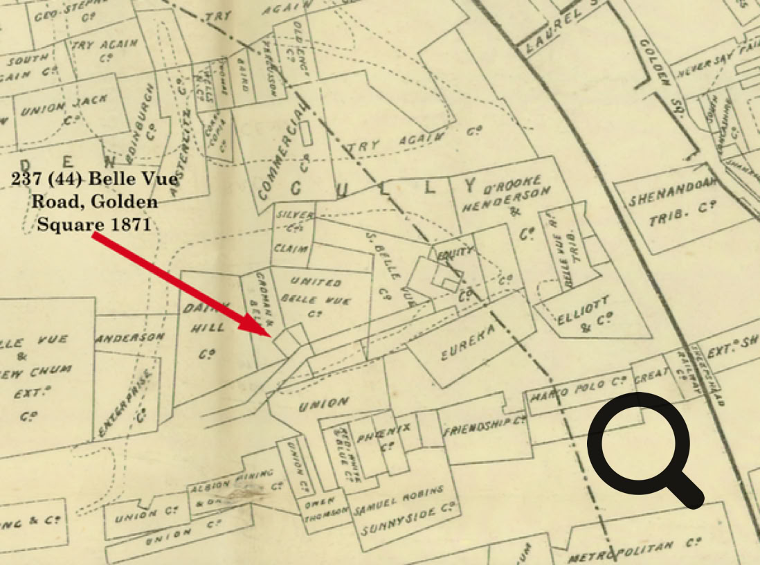 Early Maps above show the Lots just south of the United Bell Vue Company Mine and just west of Poverty Gully in 1871 and 188. The area was known as Dairy Hill, on account of the Dairy Hill United Company. For a description of the area see the article on this site - memories of the 1960s by Malcolm Qualtrough.