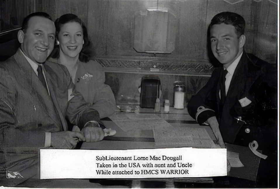 Eliza and William Eastham emigrated to Calgary, Alberta, Canada in the early 1900’s with their children. Lorne’s mother was Rhoda Eastham who married John D MacDougall. Her brother, Arthur Eastham was living near San Diego during World War II and it was Arthur and his wife, Wanda, who Lorne was able to visit when the HMCS Warrior visited San Diego, California near the end of the war.