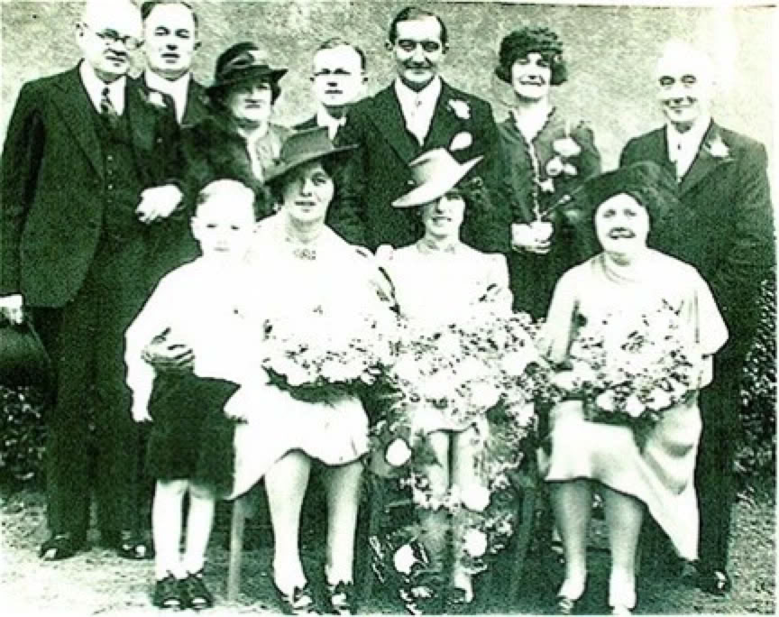 Wedding photo of Phyllis Qualtrough and Eddie Elliott in August 1940. Richard A Qualtrough is standing at the back on the left, Eddie Elliott standing directly behind his bride, Polly Qualtrough, the bride’s mother to Eddie’s left. In front left a young John William Qualtrough, and with the flowers the bride, Phyllis Qualtrough.