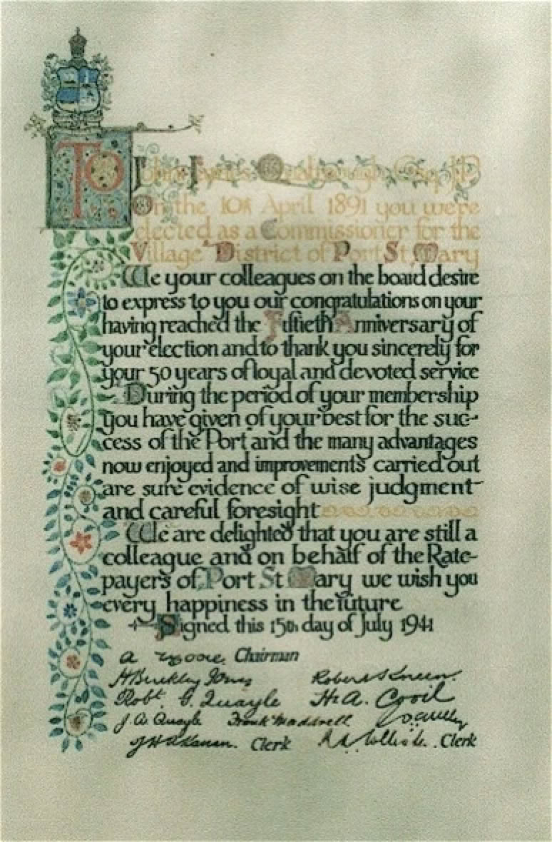 In 1941, the Town Commissioners honoured Mr Qualtrough with the following, proposed by the Chairman of the Board, Mr Moore, and seconded by Mr Maddrell, mentioned in the Town Board Minutes and reproduced here: