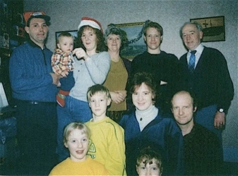 Family of John William and Beryl Qualtrough, Christmas 1999. Left to right at back: Juan Henry Qualtrough, his wife Kim holding young Juan James, Beryl Qualtrough, David Qualtrough, John W Qualtrough. In front: David Gurney, Anne Qualtrough Gurney, Peter Gurney and seated in front Karran and Hazel Gurney.