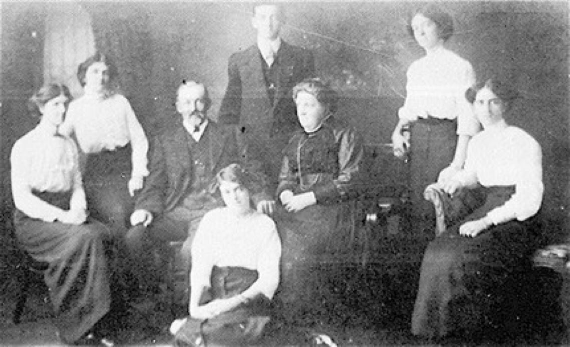 THOMAS AND MARY ANN (POLLY) QUALTROUGH and family.From Left: Ida; Elsie; Thomas; James; Polly; Amy; Elaine; and in front, Ruby. Photo taken about 1912.