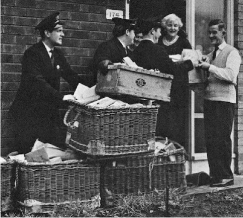 Large baskets of fan mail was received by George Harrison's parents at their house in Liverpool on his 21st birthday.Photo courtesy of: http://meetthebeatlesforreal.blogspot.com.au/2012/03/mail-and-georges-house.html